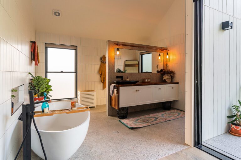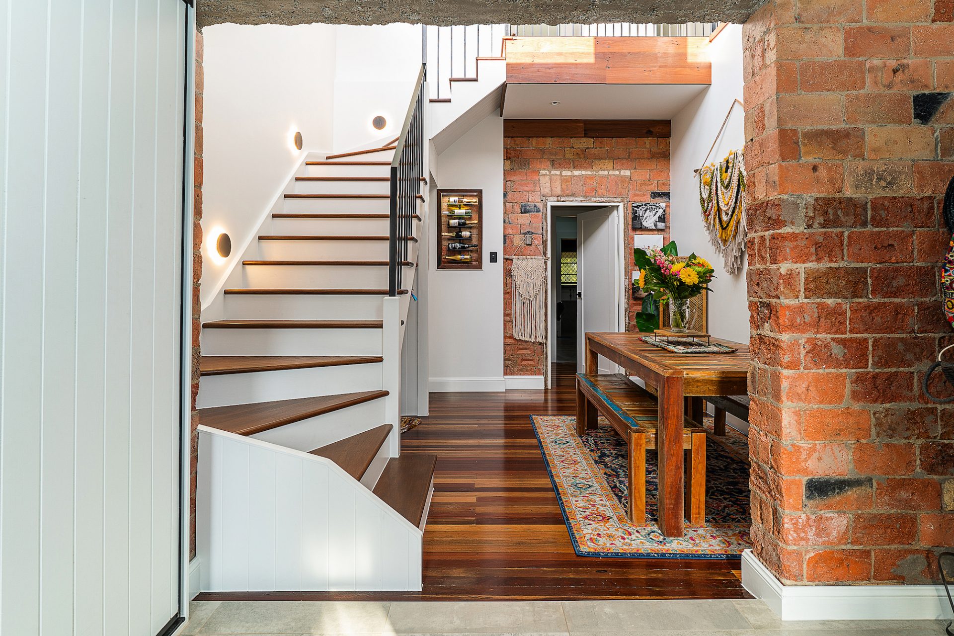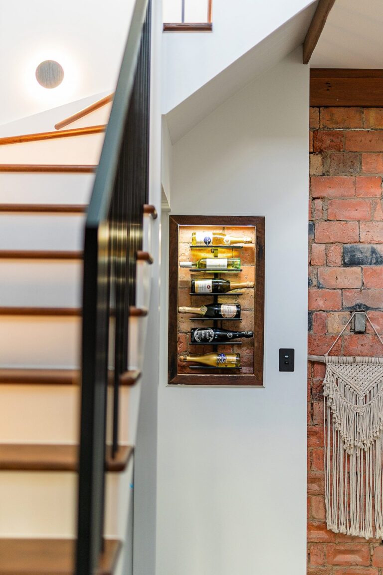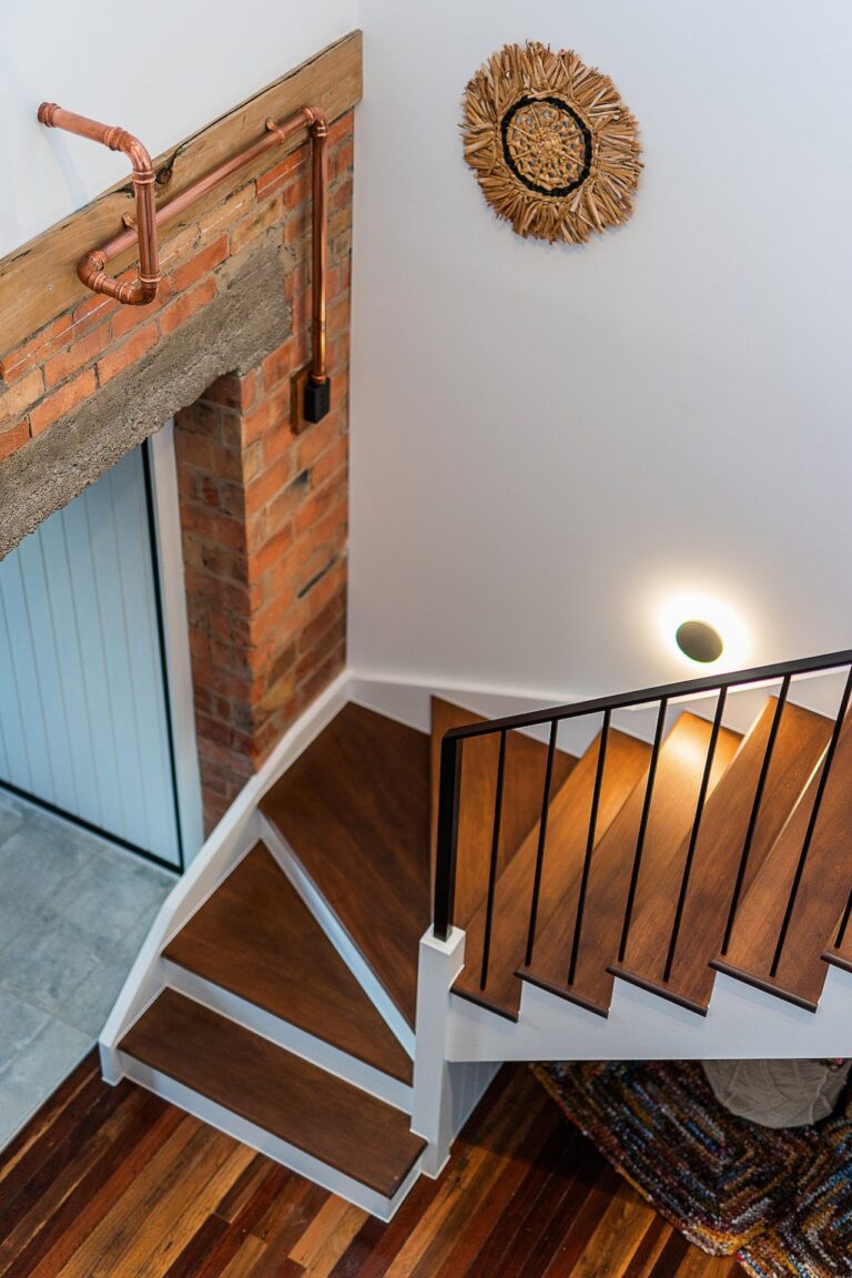 A combination of exposed brickwork, timber, metal, tile and copper pipe detail creates a beautiful blend of modern, urban and industrial style to the home that complemented earlier renovations perfectly and added unique character and charm to all spaces. Timber vanity tops and all timber details throughout the new renovation were recycled and repurposed from the original hardwood roof framing to retain history in the home.