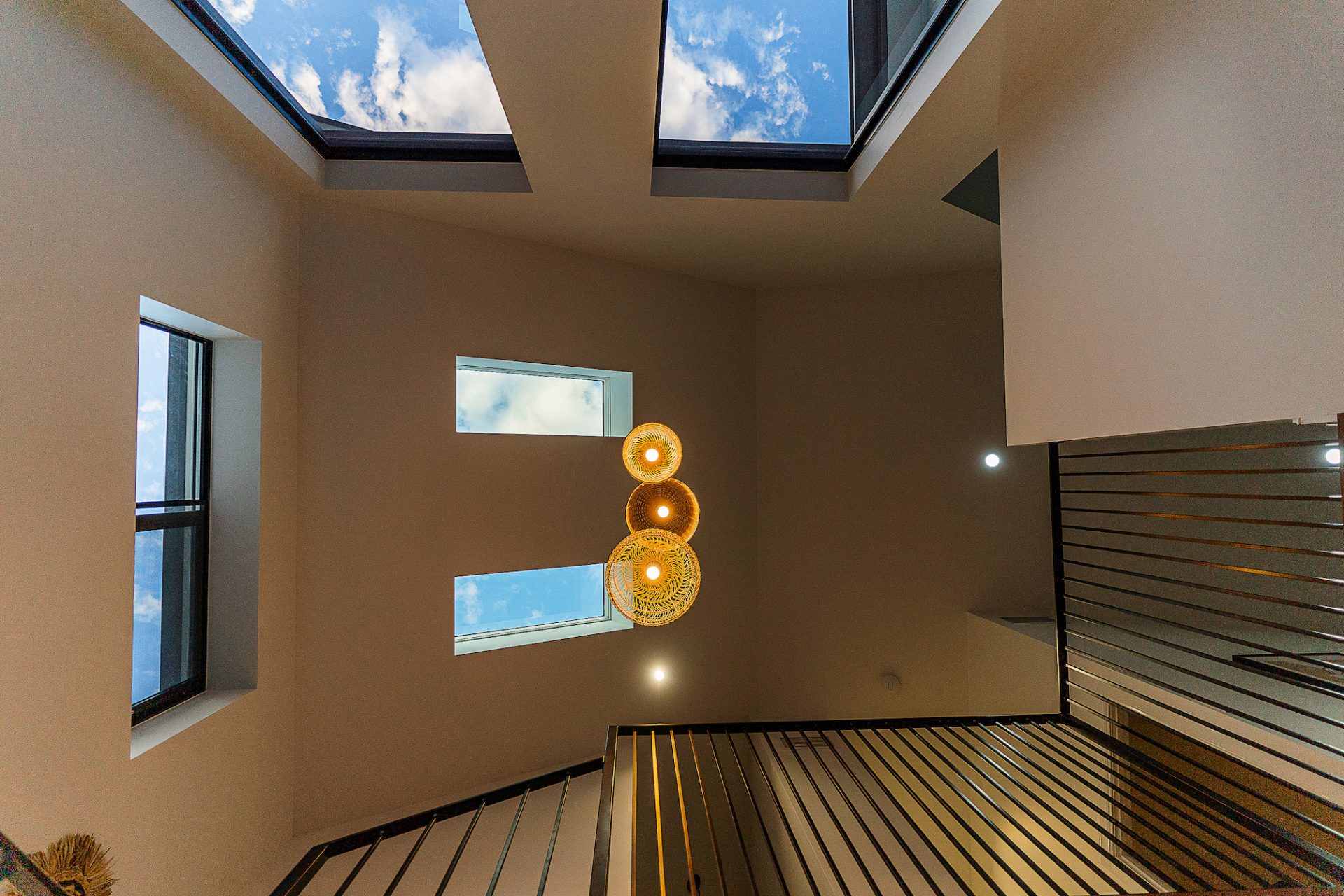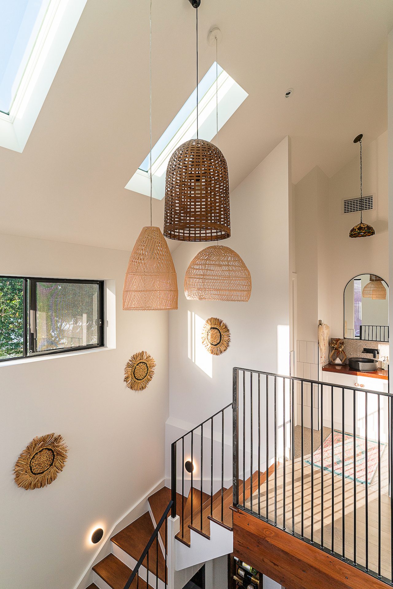 The industrial style was softened through use of rattan light fixtures to the stair well and warm soft furnishings throughout the home. All materials and colours were carefully selected to create a perfect balance of contrast and texture allowing the transition between each room to flow seamlessly.