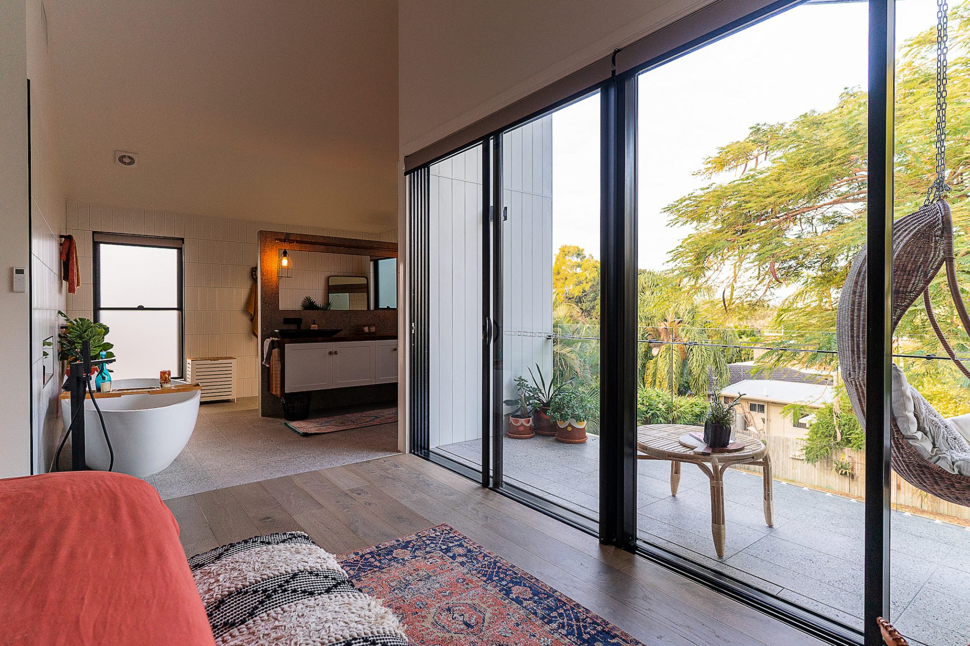 The master bedroom was designed around an existing Poinciana tree located at the rear of the block. The established tree was to be retained and with careful planning, we were able to design the master bedroom and adjoining balcony to make the most of the tree canopy giving a tree house feel to the entire room.