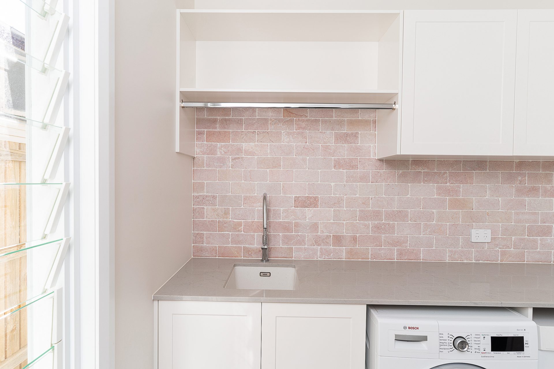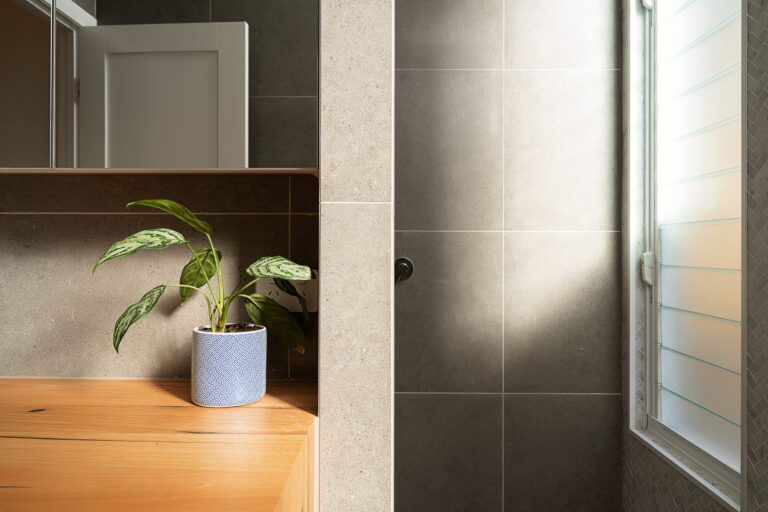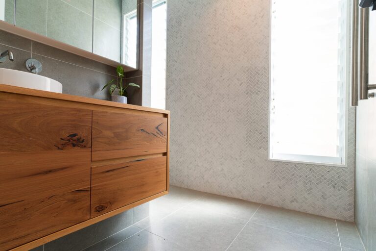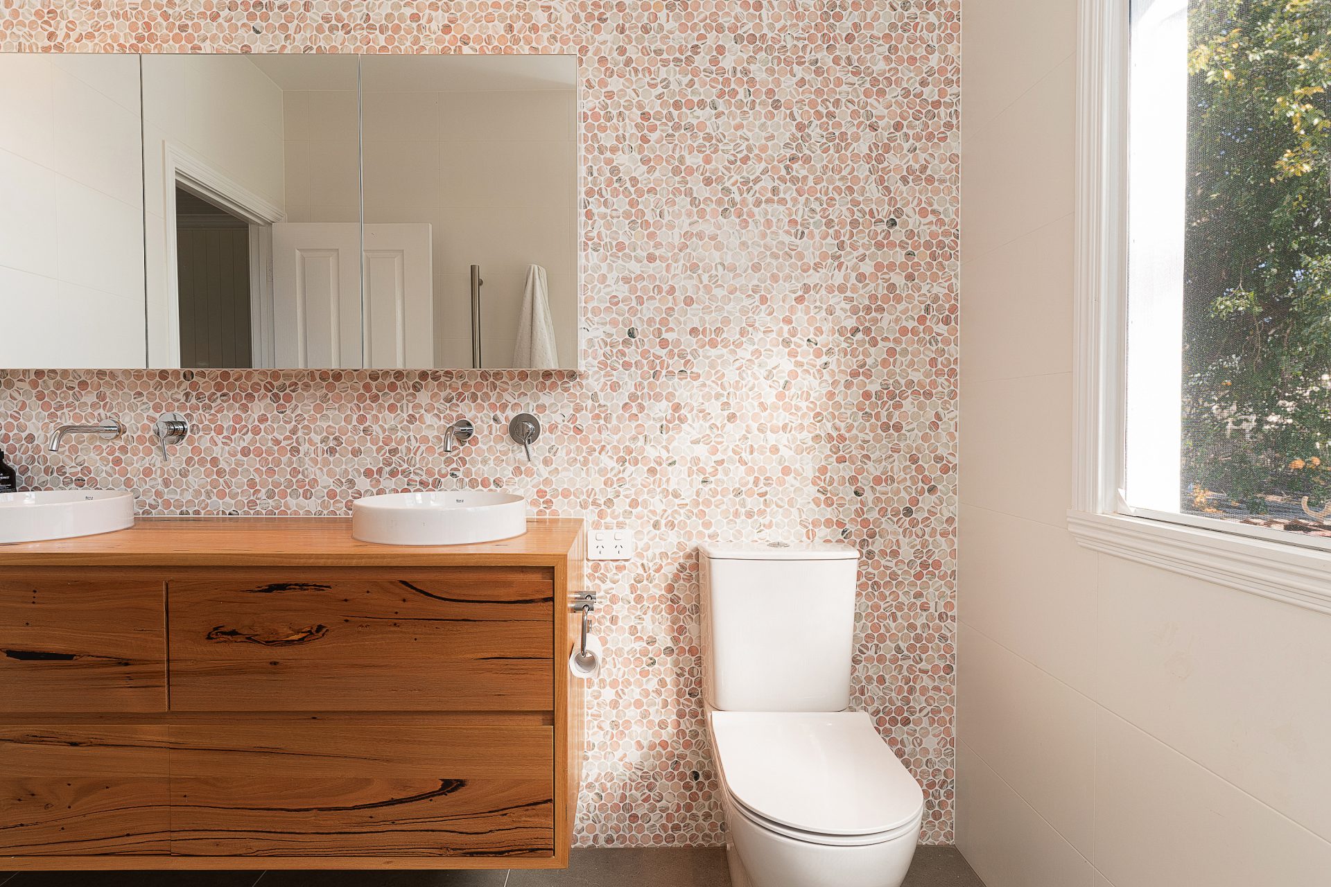 Internally, a blend of polished concrete and spotted gum timber featured throughout the home. Hints of coral and soft pink in the tile selection created a modern twist on a classic style, resulting in the contemporary feel the clients were wanting to achieve while still honouring the traditional character of the home.