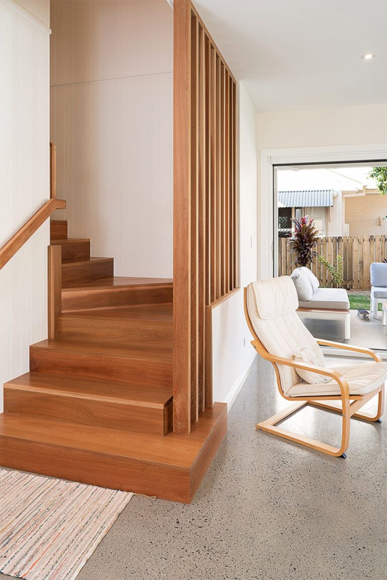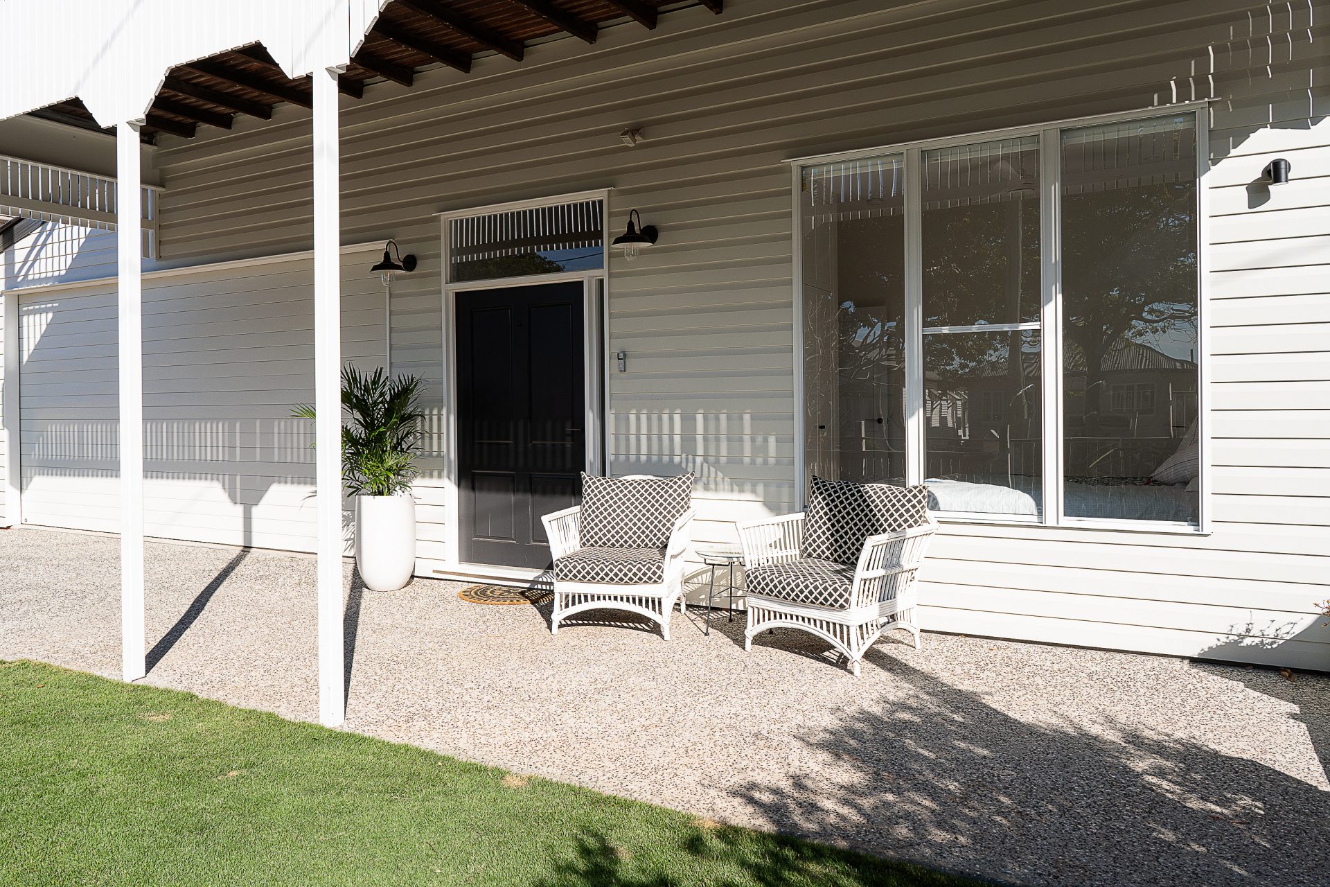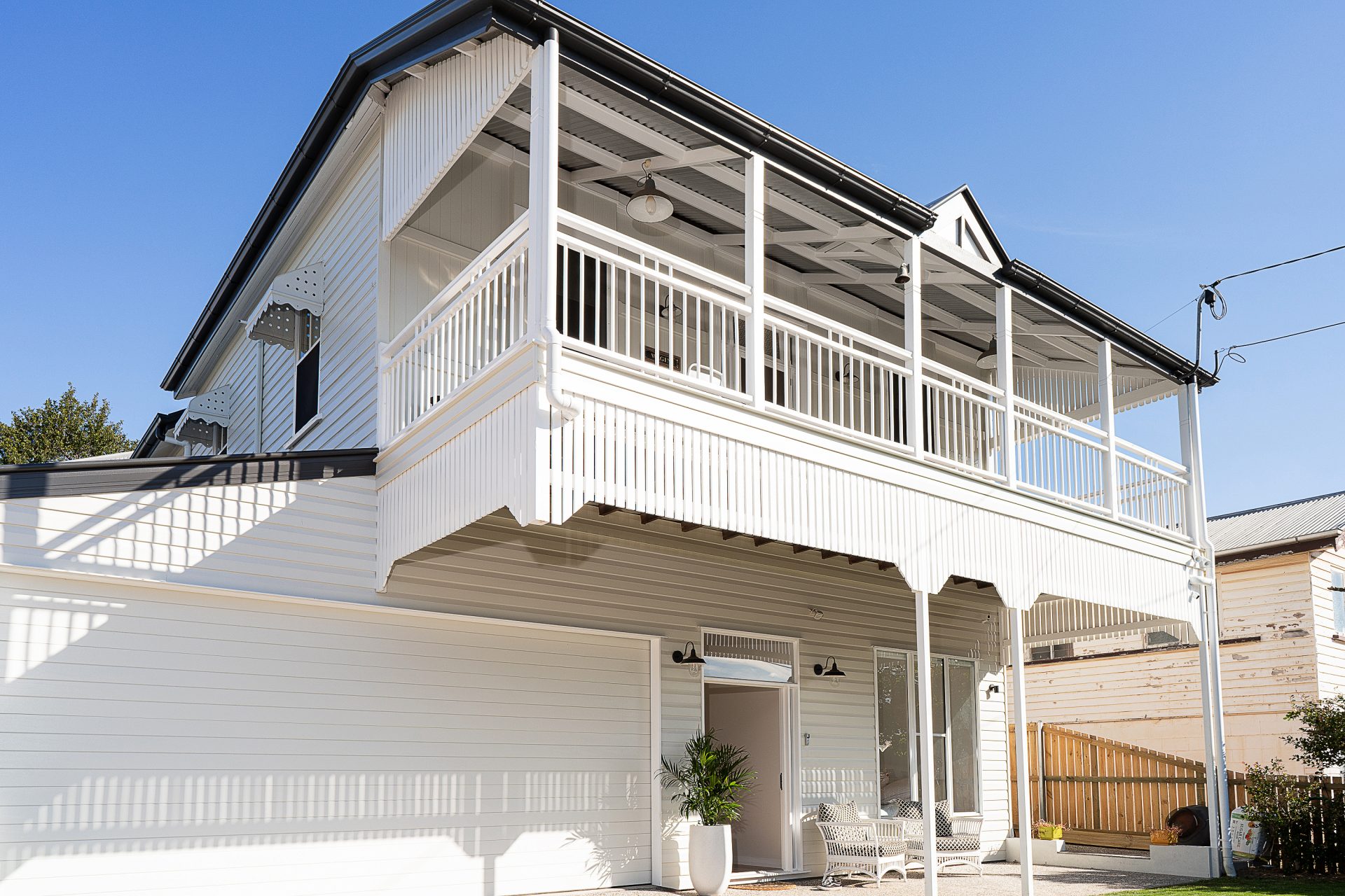Externally, the materials selected for the home blended seamlessly with the existing materials,retaining all the traditional Queenslander style and character of the home. A classic white, offwhite and grey colour palette freshened the home’s facade and enhanced the character of the home.